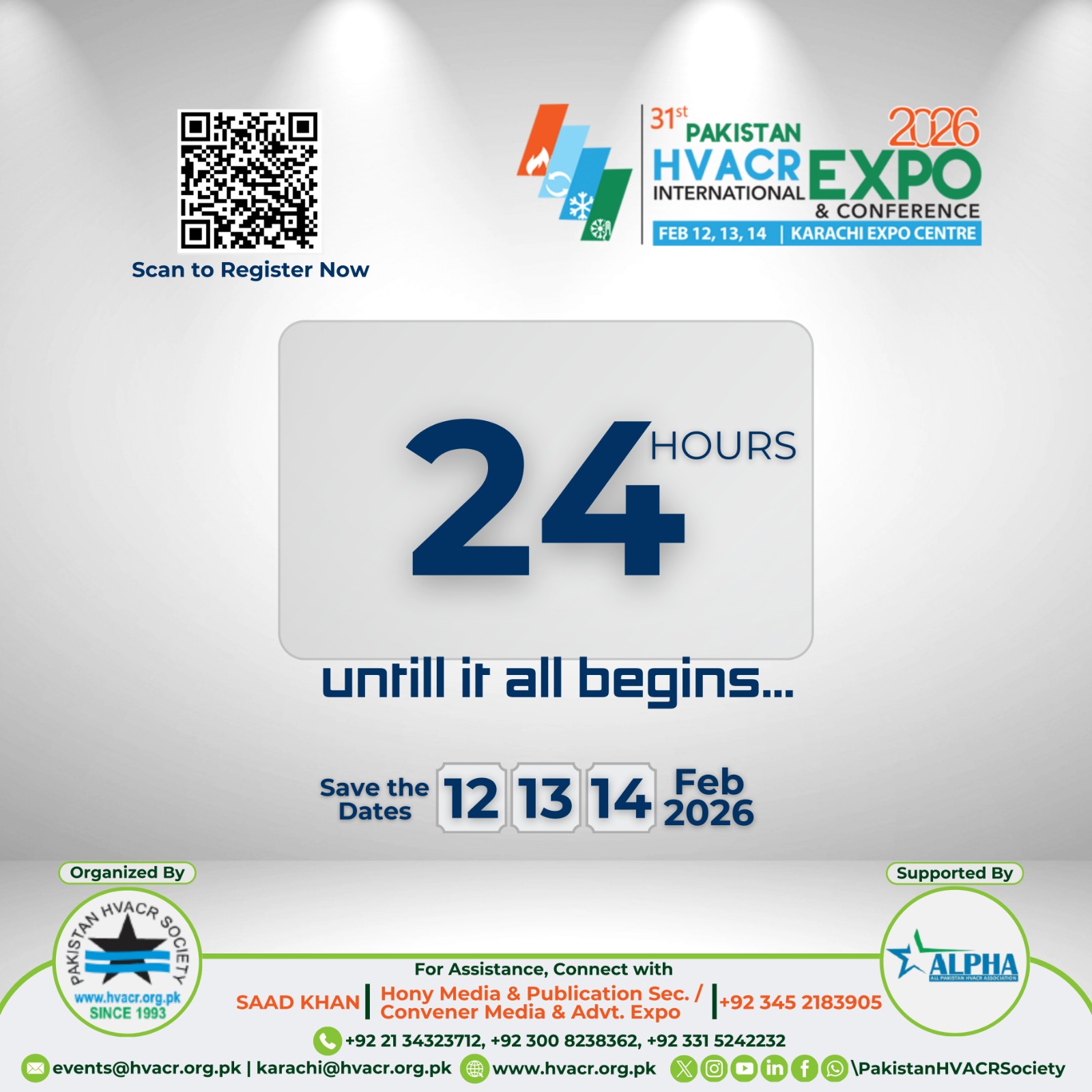DetailsOnly one day left until it all begins. From 12–14 February 2026, the stage is set at Expo Centre Karachi for three impactful days of learning, networking, and discovering the latest 𝐇𝐕𝐀𝐂𝐑 𝐬𝐨𝐥𝐮𝐭𝐢𝐨𝐧𝐬. Don’t miss your chance to be part of Pakistan’s premier HVACR gathering. Register now: https://www.hvacrexpo.org.pk/visit/e-registration.html #𝐇𝐕𝐀𝐂𝐑𝐄𝐱𝐩𝐨𝟐𝟎𝟐𝟔 #𝐇𝐕𝐀𝐂𝐑𝐄𝐱𝐩𝐨 #𝐇𝐕𝐀𝐂𝐑𝟐𝟎𝟐𝟔 #𝐇𝐕𝐀𝐂𝐑𝐂𝐨𝐧𝐟𝐞𝐫𝐞𝐧𝐜𝐞 #𝐌𝐄𝐏𝐑𝐞𝐭𝐫𝐨𝐟𝐢𝐭 #𝐇𝐕𝐀𝐂𝐑𝐞𝐭𝐫𝐨𝐟𝐢𝐭 #𝐏𝐚𝐤𝐢𝐬𝐭𝐚𝐧𝐇𝐕𝐀𝐂𝐑…